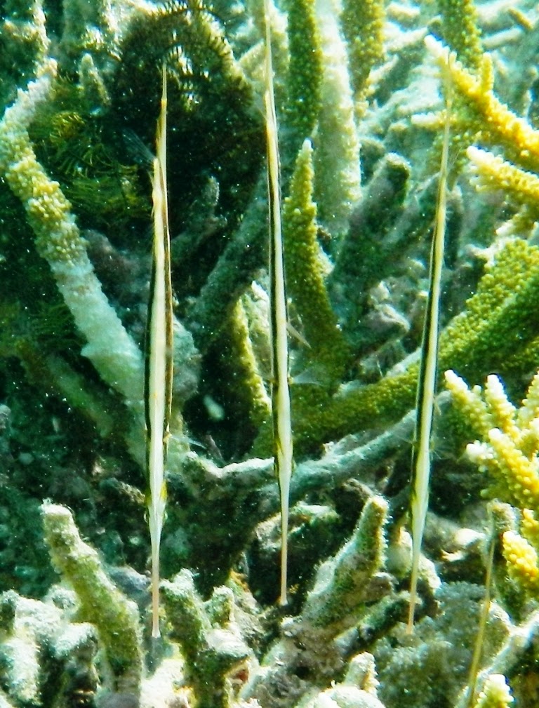 We saw a lot of first-time-seen fish, good coral, and quite a few razorfish. Just before boarding to return to shore, this amusing clown fish was spotted, flitting in and out a sea anemone, his hiding place.